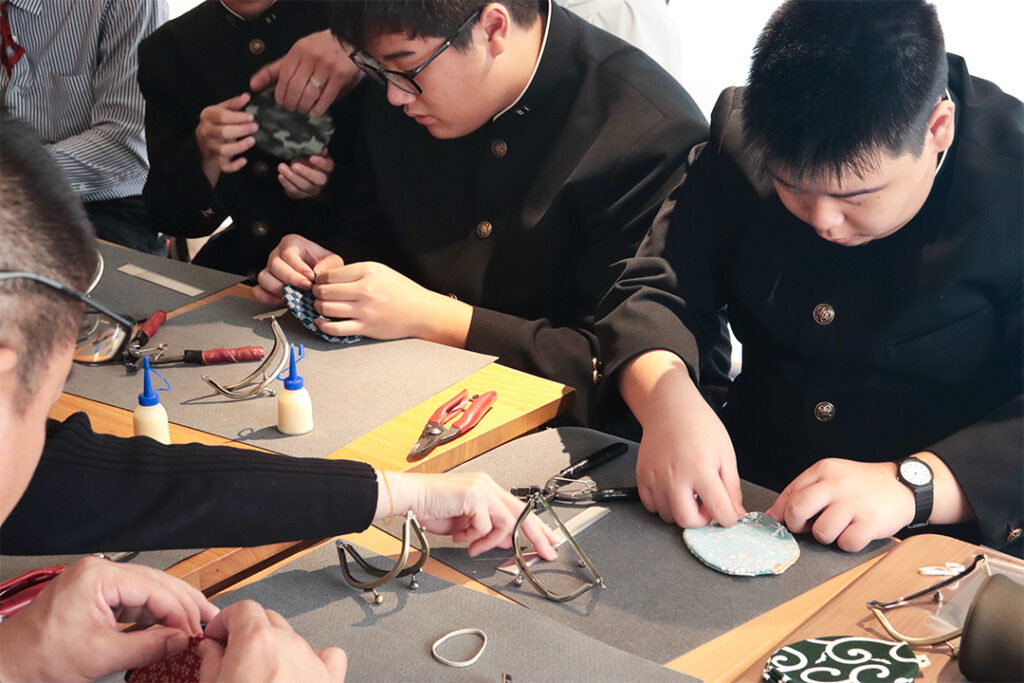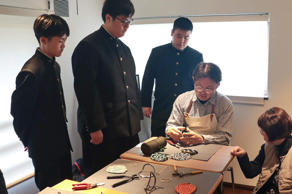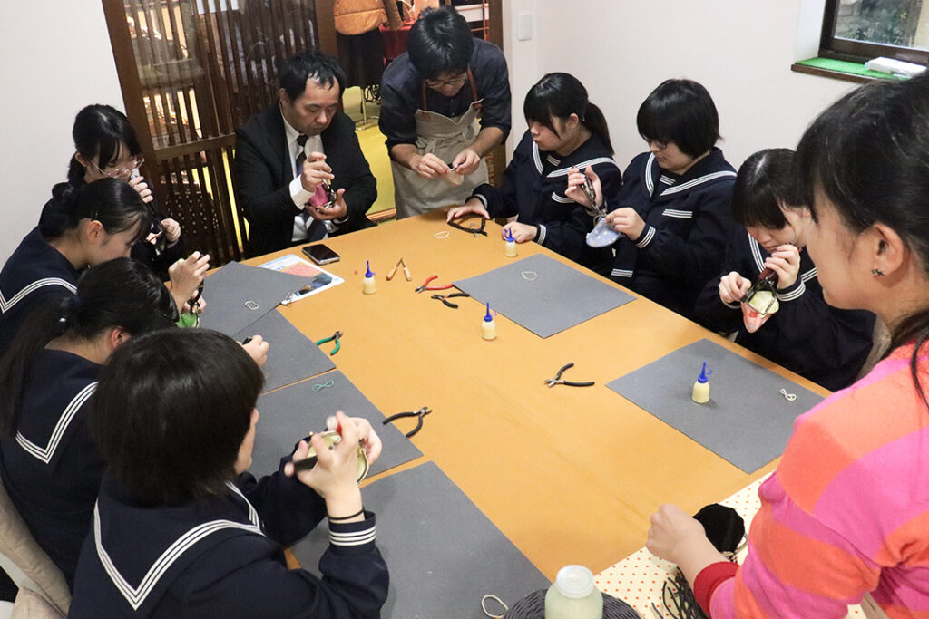 体験では、2つのグループに分かれて職人の指導を受けながら、口金の取り付け作業をしていただきました。