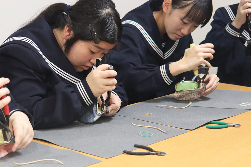 道具の扱いや慣れない作業に戸惑いながらも、職人に手助けしてもらったり、自分なりの工夫を取り入れながら進め、終始明るい雰囲気で取り組んでいました。完成したがま口を手にした際の達成感あふれる笑顔がとても印象的でした。